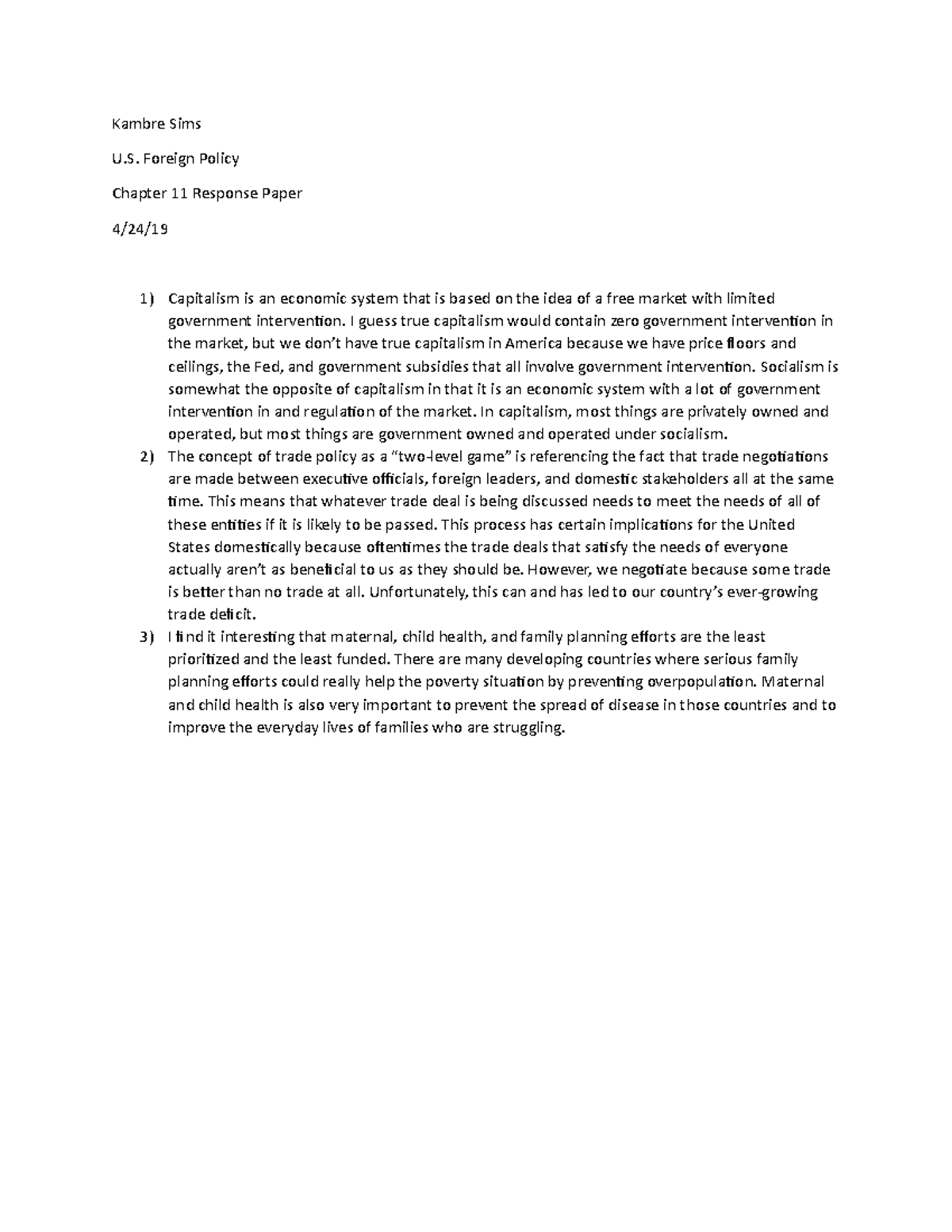 Chapter 11 Response Paper Kambre Sims U. Foreign Policy Chapter 11 Response Paper 4/24/19 1