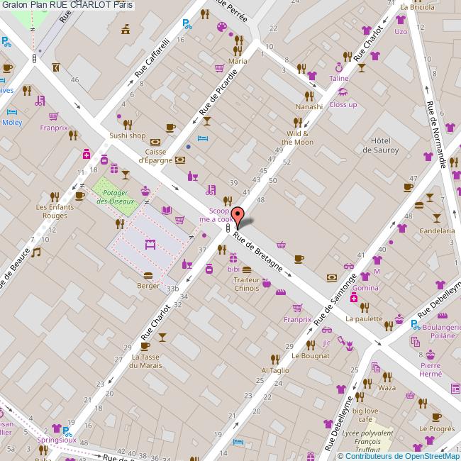 Café Charlot. 38 Rue de Bretagne 75003 Paris Tel. : 01 44 54 03 30. > Website. Facing the Market Enfants Rouges, the oldest market in Paris created in 1610, discover this place for fashion and "people" of the Haut Marais. Café Charlot has become in a very short time, "The place to be ". Take a seat in the only sunny terrace on the north side.