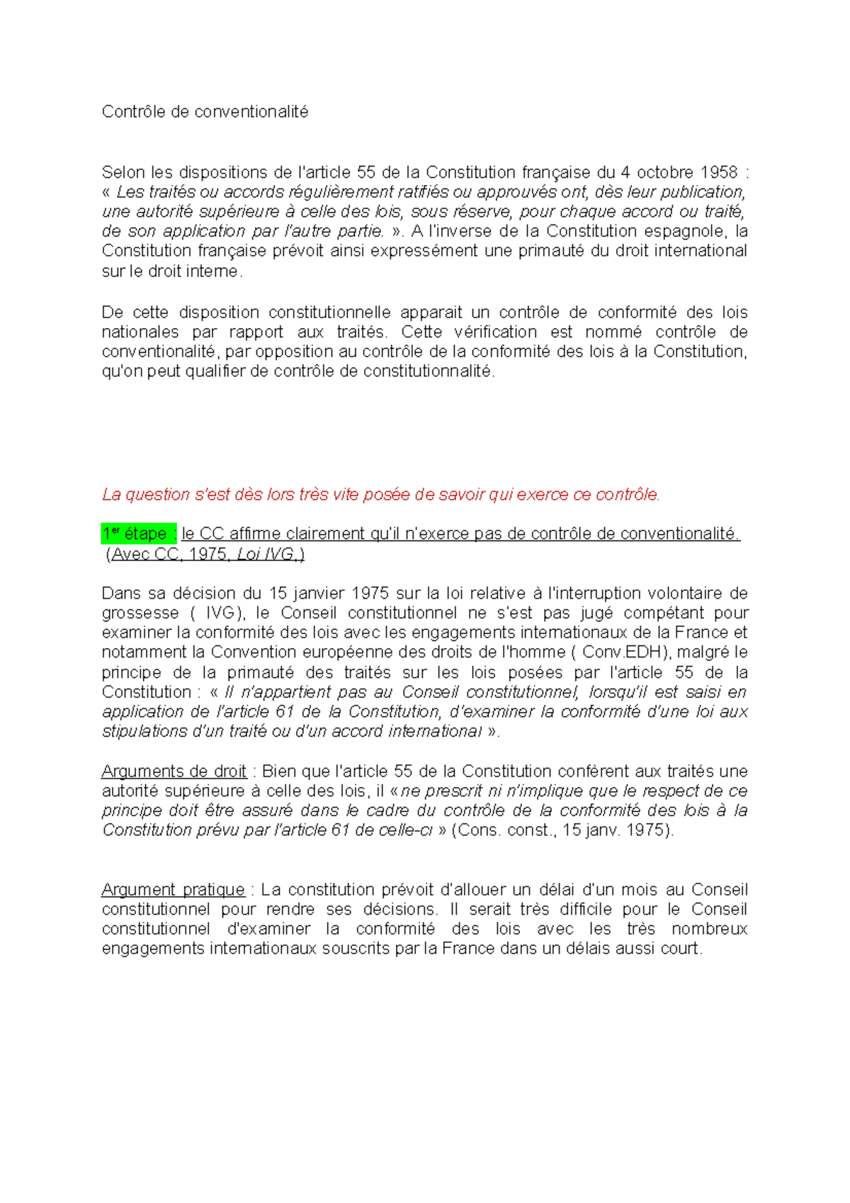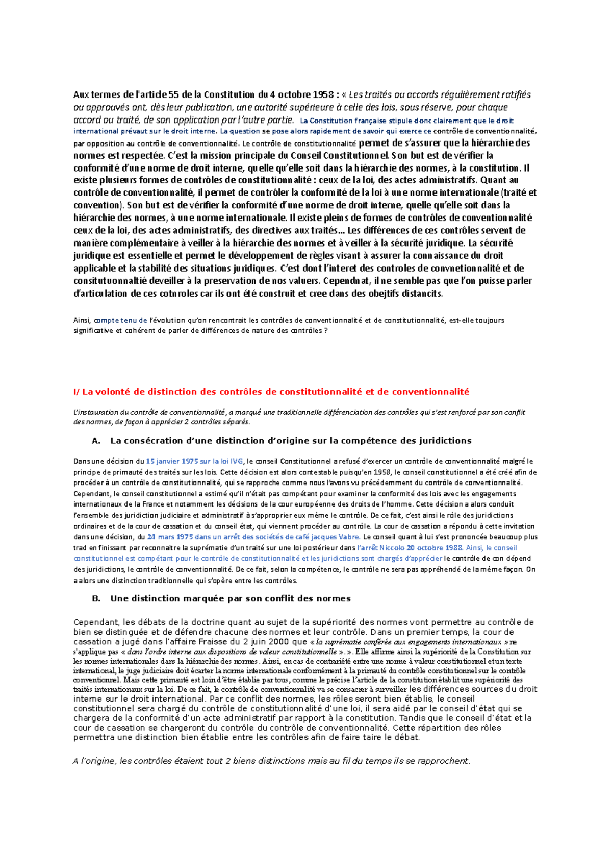 Contrôle de constitutionnalité et contrôle de conventionnalité Aux termes de l'article 55 de