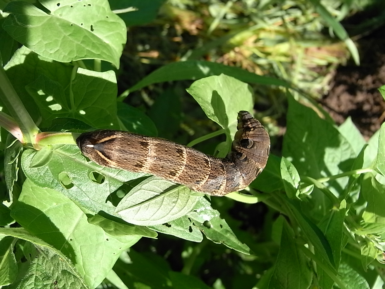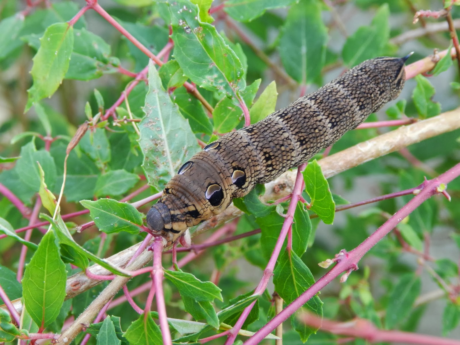 Le grand sphinx de la vigne. Deilephila elpenor. Cette chenille passe facilement inaperçue parmi les herbes sèches ! Son scolus est peu développé mais bien présent ce qui la différencie du petit sphinx de la vigne. De nos jours la vigne n'a plus rien à craindre, la raison semble évidente… alors ces jolies petits sphinx se rabattent.