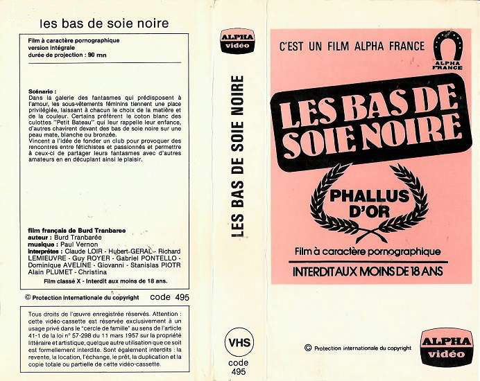 Les bas de soie noire. Burd Tranbaree, France, 1981. 85 min. Feature Porno films. Basic information Credits. Original title : Les bas de soie noire Danish title : Sorte silkestrømper Director : Burd Tranbaree: Director of Photography : Pierre Fattori: Editor : Robert Rongier: Composer : Paul Vernon.