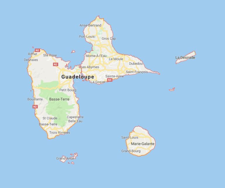 La Guadeloupe est une île tropicale située dans les Caraïbes, à proximité de l'océan Atlantique. Elle se trouve à environ 6700 kilomètres de la France, 2900 kilomètres de New York et 3400 kilomètres de Montréal, et est à peu près à mi-chemin entre l'équateur et le tropique du Cancer. En dezoomant la carte de Guadeloupe, on se.