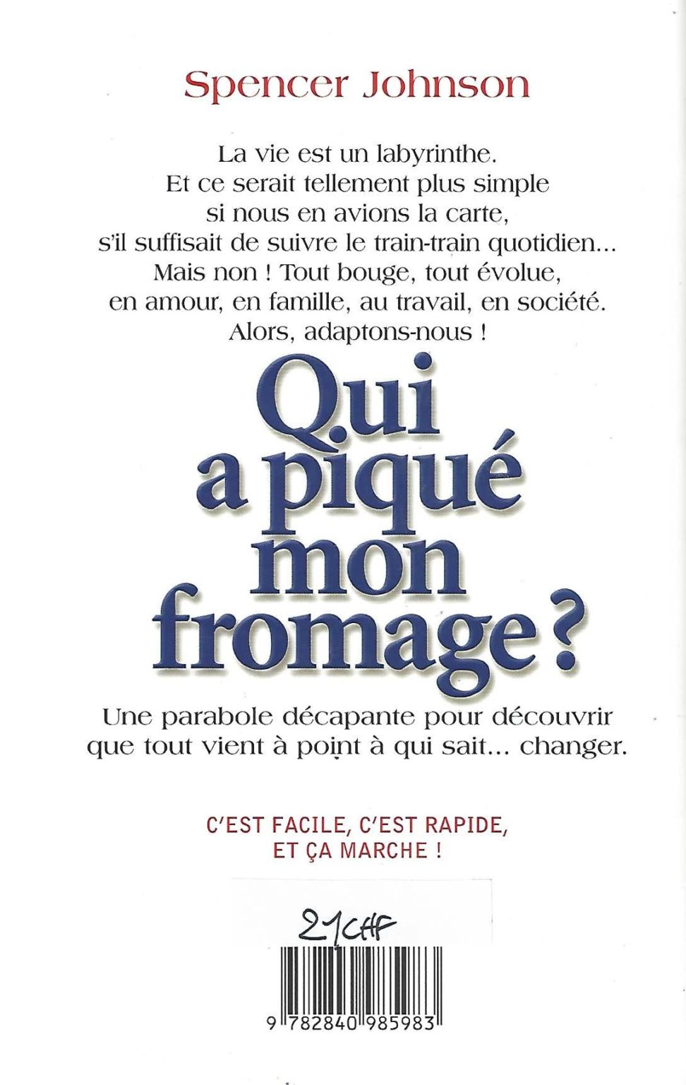 Qui a piqué mon fromage. Hardcover - September 14, 2000. La vie est un labyrinthe. Et ce serait tellement plus simple si nous avions la carte, s'il suffisait de suivre le train-train quotidien. Mais non ! Tout bouge, tout évolue, en amour, en famille, au travail, en société. Alors, adaptons-nous !