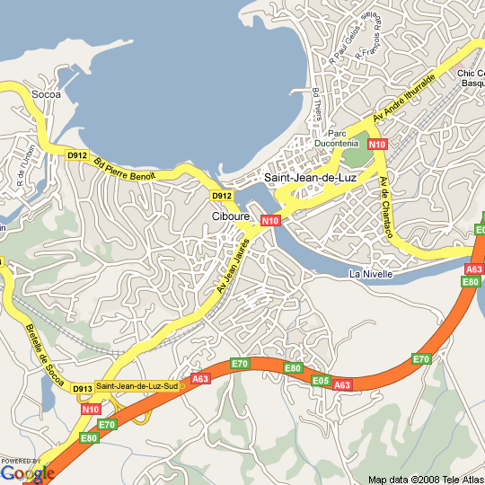 Carte satellite de la ville de Saint-Jean-de-Luz. 1- Cliquez ici pour charger la carte imprimable de Saint-Jean-de-Luz. 2- Centrez la carte satellite sur la zone souhaitée. 3- Zoomez à l'aide du curseur à gauche de la carte. 4- Cliquez sur le lien suivant pour imprimer cette carte satellite de Saint-Jean-de-Luz en pleine page :